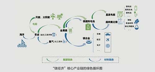 “鎂經濟”是新能源與新材料相融合的綠色循環(huán)經濟。“鎂經濟”綠色循環(huán)產業(yè)鏈的源頭,從原料講是取之不盡的海鹵水,從能源講是用之不竭的可再生能源。利用鎂既是工業(yè)材料又是能源載體的雙重屬性,“鎂經濟”可同時實現(xiàn)新能源和新材料兩大產業(yè)的綠色循環(huán)、優(yōu)勢整合:既解決了風光電的儲能難題,又將無法處理的鹽化工行業(yè)廢棄物苦鹵“變廢為寶”,變成可帶動國民經濟眾多領域實現(xiàn)產業(yè)升級的重要基礎材料。