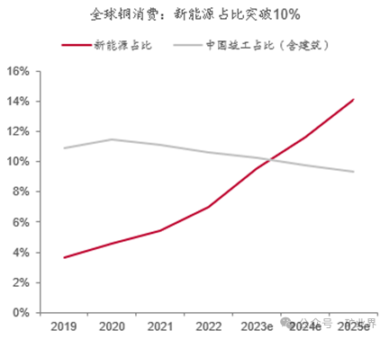 新能源領(lǐng)域?qū)︺~需求的增量,已基本上抵消了國內(nèi)傳統(tǒng)房地產(chǎn)下滑所帶來的負(fù)面影響。近日,中泰證券研究所有色金屬首席分析師謝鴻鶴曾表示,2023年全球新能源制造對銅鋁的消費(fèi)量已經(jīng)占到總消費(fèi)量的10%,而國內(nèi)房地產(chǎn)竣工端對銅鋁(指狹義的直接使用部分)的消費(fèi)也在2023年被“壓縮”到了10%附近。
