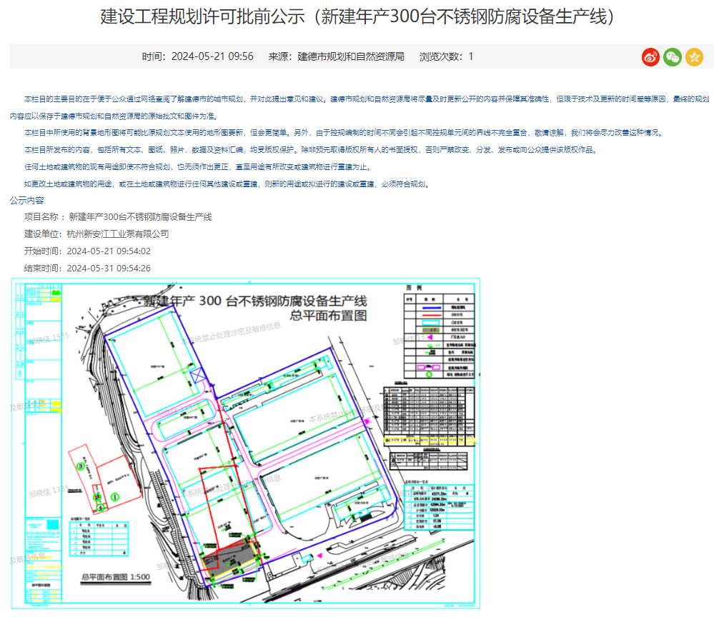 建德市人民政府消息,5月21日,建德市規(guī)劃和自然資源局就杭州新安江工業(yè)泵有限公司新建年產(chǎn)300臺不銹鋼防腐設(shè)備生產(chǎn)線建設(shè)工程規(guī)劃許可進行批前公示,公示期:5月21-31日。