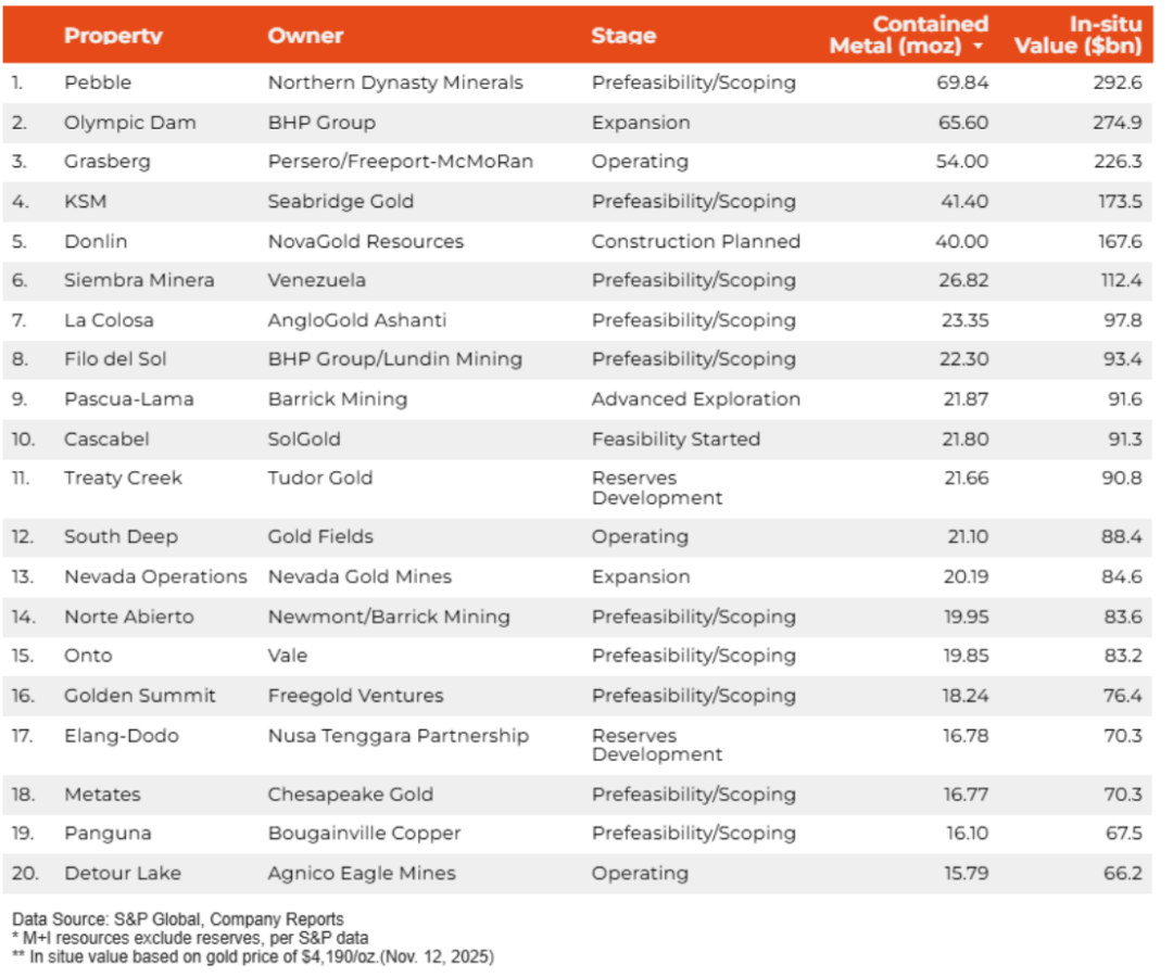 據(jù)minging.com統(tǒng)計,排名第一的是北方皇朝礦產(chǎn)公司(NDM)的佩布爾(Pebble)金礦項目,該礦位于美國阿拉斯加州布里斯托灣附近,其中金資源量6984萬盎司,約等于2176.23噸。除了黃金之外,據(jù)估算,該礦山預(yù)測礦產(chǎn)資源量為2587.8萬噸的銅、154.36萬噸的鉬和3.45億盎司的銀,是世界上資源最豐富的礦床之一。但該項目已經(jīng)停滯了十多年,當(dāng)?shù)丨h(huán)保人士、居民和漁業(yè)人員堅決反對開發(fā)Pebble礦山。