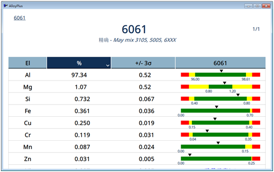 奧林巴斯Vanta分析儀在鋁合金中的測試數(shù)據(jù)界面: