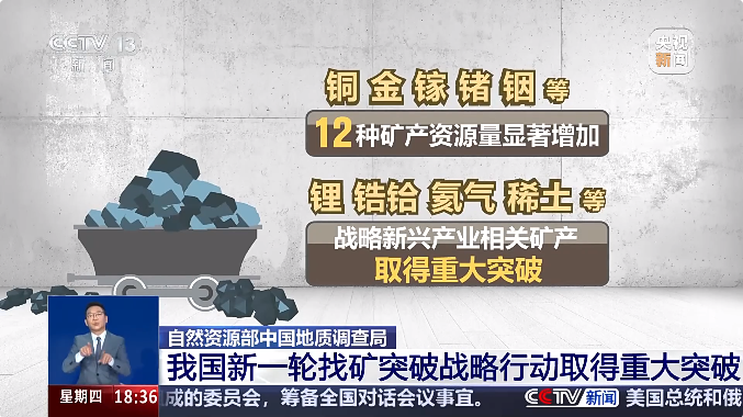 中國工程院院士唐菊興介紹,新一輪找礦突破行動,36個礦種采取一礦一策。既有石油、天然氣、煤炭、鐵、錳等大宗礦產,也有鋰、稀土等戰(zhàn)略新興礦產。