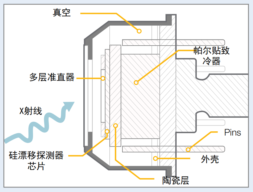 XRF探測器基本上是由硅晶圓(一種用于探測X射線的半導(dǎo)體材料)、制冷器和電子器件組成。