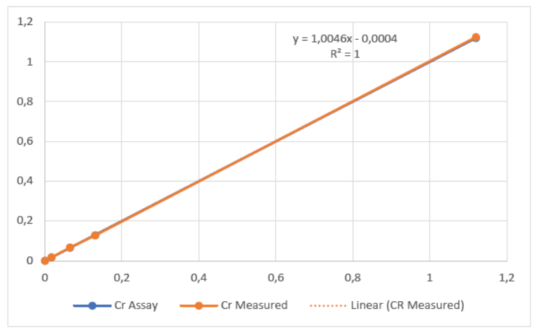 根據(jù)腐蝕模型的預(yù)測,鉻含量低于0.04%的碳鋼會很容易受到流動(dòng)加速腐蝕。這個(gè)監(jiān)控閾值處于奧林巴斯Vanta分析儀測量鐵基鋼材中鉻元素含量的分析范圍內(nèi)。在碳鋼管道中加入少量的鉻,可以大大減少流體加速腐蝕的速度。因此,對碳鋼中低含量的鉻(Cr)進(jìn)行高精度的測量,是預(yù)測這些管道使用壽命的關(guān)鍵。