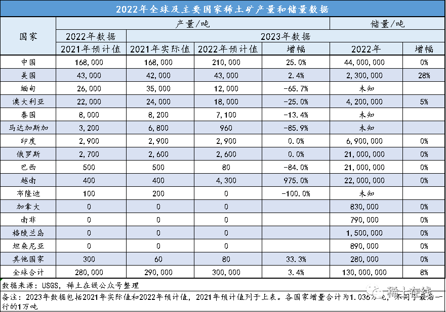2022年全球稀土礦產(chǎn)量30萬噸,相比于2021年實(shí)際值增加1萬噸,增幅3.4%,小于2021年的16.7%,增速放緩,主要國家稀土礦產(chǎn)量見下表。
