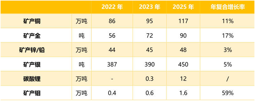 紫金礦業(yè)主要在全球范圍內(nèi)從事銅、金、鋅、鋰等金屬礦產(chǎn)資源勘查、開發(fā)及工程設(shè)計(jì)、技術(shù)應(yīng)用等業(yè)務(wù)。以大型超大型礦產(chǎn)的逆周期并購(gòu)和自主地質(zhì)勘探增儲(chǔ)為重點(diǎn),這也為紫金礦業(yè)持續(xù)發(fā)展提供了堅(jiān)實(shí)的資源基礎(chǔ)。截至 2022 年 底,公司保有探明和控制及推斷的資源量: 銅 7371.86 萬(wàn)噸、金 3117.39 噸、鋅(鉛)1118.33 萬(wàn)噸、銀 14611.80 噸,鋰資源量(當(dāng)量碳酸鋰) 1215.21 萬(wàn)噸。銅權(quán)益儲(chǔ)量占中國(guó)儲(chǔ)量 92%,金權(quán)益儲(chǔ)量占中國(guó)儲(chǔ)量 40%,是中國(guó)控制有色金屬礦產(chǎn)資源最多的大型礦業(yè)公司。