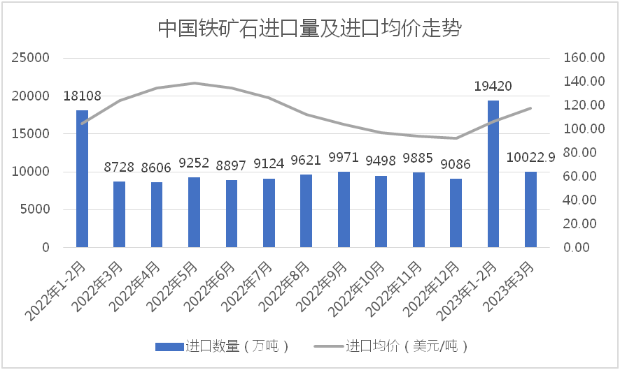 據(jù)海關(guān)總署數(shù)據(jù)顯示,2023年1-3月份,我國累計(jì)進(jìn)口鐵礦石29433.5萬噸,同比增長9.8%,進(jìn)口均價(jià)110.6美元/噸,同比下降12.0%。但值得注意的是,今年3月份,我國進(jìn)口鐵礦石量價(jià)齊升,單月進(jìn)口鐵礦石達(dá)到10022.9萬噸,同比增長14.8%,進(jìn)口均價(jià)為117.7美元/噸,較今年1-2月均價(jià)上漲11.43美元/噸,增長10.76%。