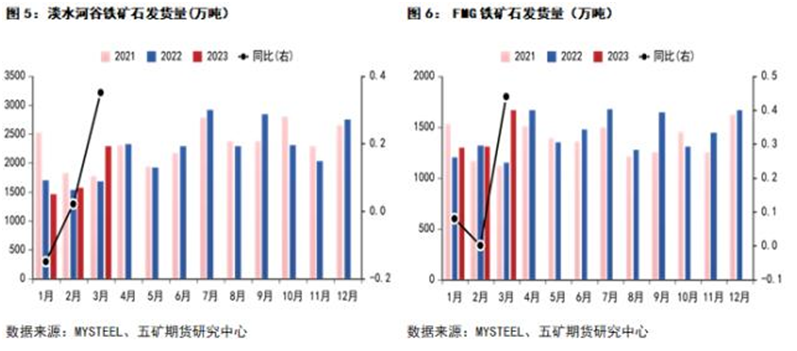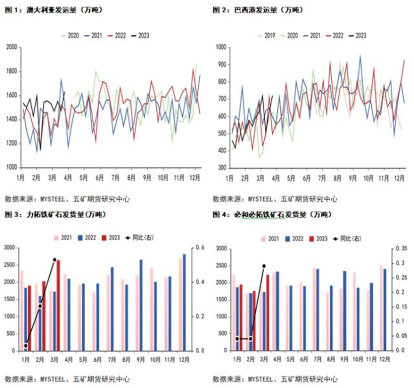 據(jù)mysteel和五礦期貨統(tǒng)計(jì),四大礦山3月份發(fā)貨數(shù)據(jù)同比大幅增加。3月份力拓發(fā)貨量2595.6萬噸,同比增加50%;必和必拓發(fā)貨量2152萬噸,同比增加25%。淡水河谷發(fā)貨量2189.4萬噸,同比增加30%;FMG發(fā)貨量1622.3萬噸,同比增加41%。