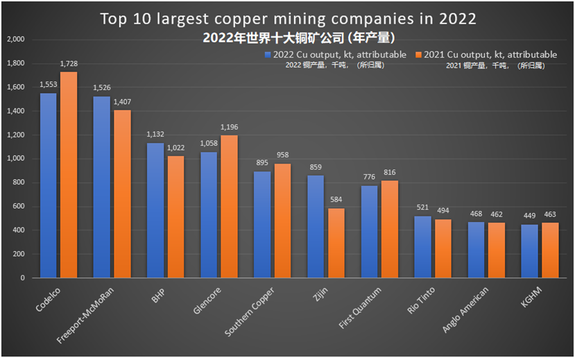 全球前十大銅礦生產(chǎn)商中,中國(guó)的紫金礦業(yè)(Zijin Mining)產(chǎn)銅85.9萬(wàn)噸,較2021年增產(chǎn)27.5萬(wàn)噸,同比增長(zhǎng)47%,排名全球第六,僅僅落后于排名第五的南方銅業(yè)(Southern Copper)3.6萬(wàn)噸銅。2022年,南方銅業(yè)(Southern Copper)銅總產(chǎn)量89.5萬(wàn)噸,同比下降6.6%。