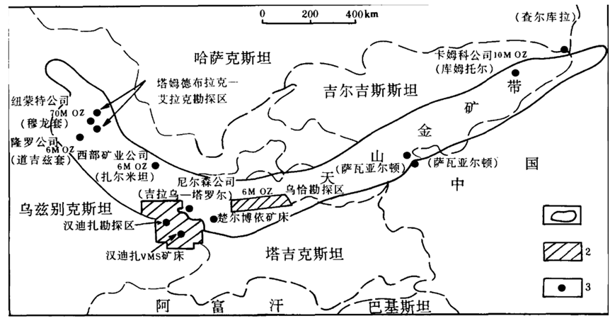 天山西段,從烏茲別克斯坦向東,經(jīng)塔吉克斯坦、吉爾吉斯斯坦到中國新疆,構(gòu)成了世人矚目的巨型金成礦帶,即“亞洲金腰帶”。烏茲別克斯坦、吉爾吉斯斯坦等幾個國家在這條成礦帶上發(fā)現(xiàn)了眾多大型、超大型金礦。其中,最為著名的當(dāng)屬于烏茲別克斯坦的穆龍?zhí)捉鸬V床,該礦是世界級超大型獨立金礦床,遠景資源儲量預(yù)估1.7億盎司(5287.6噸),平均品位約3.5克/噸。該礦2022年生產(chǎn)了約1700盎司(約48.2噸)的黃金,是全球第二大在產(chǎn)金礦。