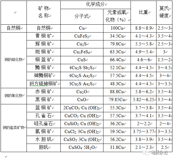 表 銅礦物化學(xué)成分及其比重