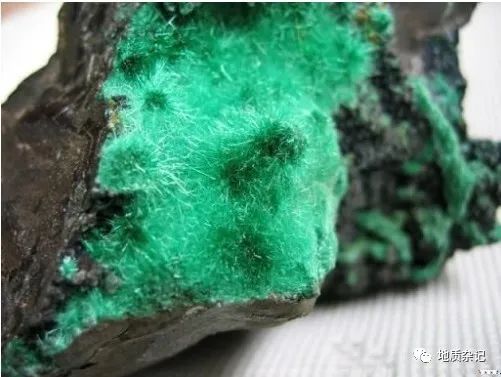 成分為Cu2[CO3](OH)2,Cu57.4%。單斜晶系。晶體呈針狀,通常呈放射狀或鐘乳狀集合體。綠色。玻璃光澤。硬度3.5-4。密度3.9-4..0g/cm3。遇鹽酸起泡。