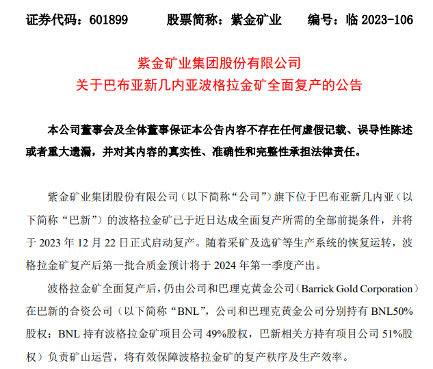 紫金礦業(yè)旗下巴布亞新幾內(nèi)亞波格拉金礦峰回路轉(zhuǎn),迎來復(fù)產(chǎn)倒計(jì)時(shí)。12月11日,紫金礦業(yè)發(fā)布公告,宣布波格拉金礦已于近日達(dá)成全面復(fù)產(chǎn)所需的全部前提條件,并將于2023年12月22日正式啟動(dòng)復(fù)產(chǎn),預(yù)計(jì)將于2024年第一季度產(chǎn)出第一批合質(zhì)金。