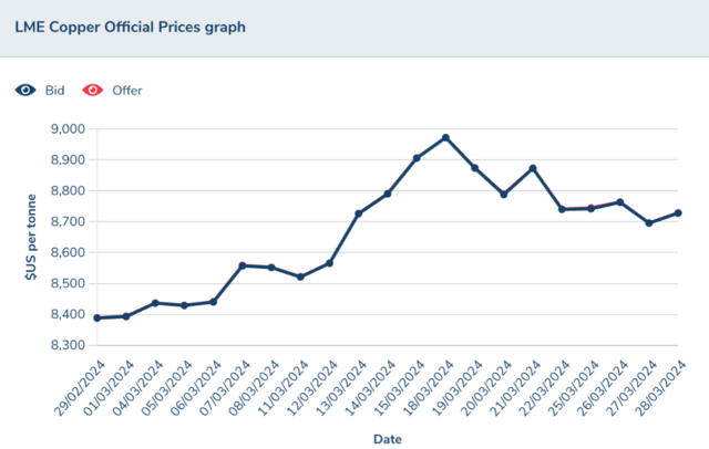 3月份以來(lái)全球銅價(jià)持續(xù)走高,3月16日,國(guó)際銅價(jià)(LME銅)一度上破至9000美元/噸關(guān)口;截至當(dāng)前,國(guó)際銅價(jià)依然超過(guò)8700美元/噸。