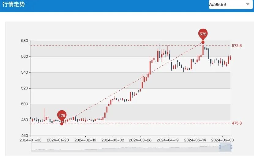 拉長(zhǎng)時(shí)間看,盡管近期現(xiàn)貨黃金價(jià)格有所回落,但年初至6月7日漲幅仍超11%。國(guó)內(nèi)金價(jià)亦不斷攀升,上海黃金交易所AU9999年內(nèi)最高觸及578元/克,較年初低點(diǎn)475元/克漲幅達(dá)21.68%。