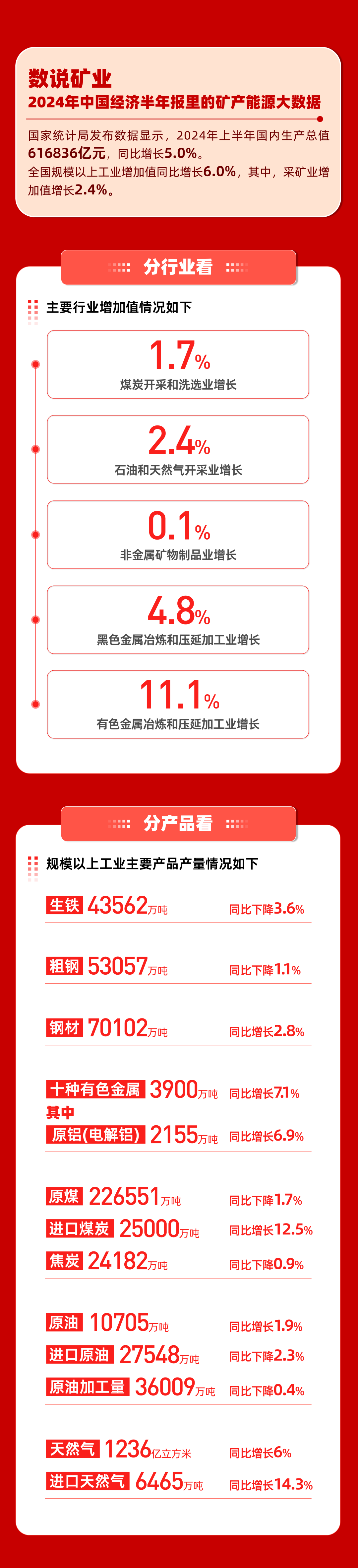 7月15日,國家統(tǒng)計(jì)局公布2024年經(jīng)濟(jì)半年報。2024年上半年國民經(jīng)濟(jì)運(yùn)行總體平穩(wěn),國內(nèi)生產(chǎn)總值超60萬億元,同比增長5%。全國規(guī)模以上工業(yè)增加值同比增長6%,其中,采礦業(yè)增加值增長2.4%。