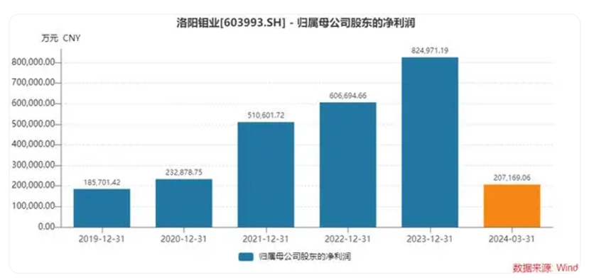 據(jù)洛陽鉬業(yè)披露的2024年上半年業(yè)績預(yù)告顯示,預(yù)計上半年實(shí)現(xiàn)凈利潤潤為51.89億元到57.35億元,同比增加638%至716%,其中今年二季度凈利潤高達(dá)31.17億元至36.63億元,為上市以來單季利潤次高。據(jù)測算,洛陽鉬業(yè)2024年凈利潤將達(dá)到110-120億元。