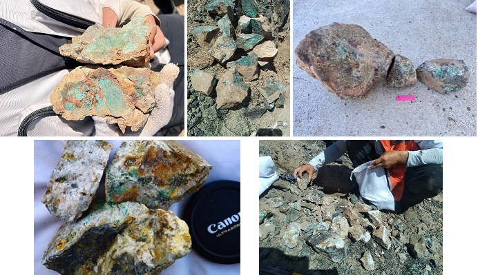 其中1處銅(金)多金屬礦帶走向近東西向,初步控制礦帶長(zhǎng)約400米,寬約20米,帶內(nèi)見(jiàn)大量孔雀石、石英褐鐵礦化及原生黃銅礦,快速分析儀顯示新鮮面銅普遍大于5%(孔雀石化處銅大于70%),同時(shí)有金、鉛、鋅顯示。另一處銅金多金屬礦帶走向280度,斷續(xù)長(zhǎng)近600米,寬10-20米不等,帶內(nèi)發(fā)現(xiàn)多處硅化銅鉛礦體,主要為孔雀石、黃銅礦及方鉛礦,目估銅品位大于5%。另外幾處銅礦點(diǎn)經(jīng)地表取樣也發(fā)現(xiàn)塊狀富銅礦體,目估化學(xué)樣品位銅大于5%。