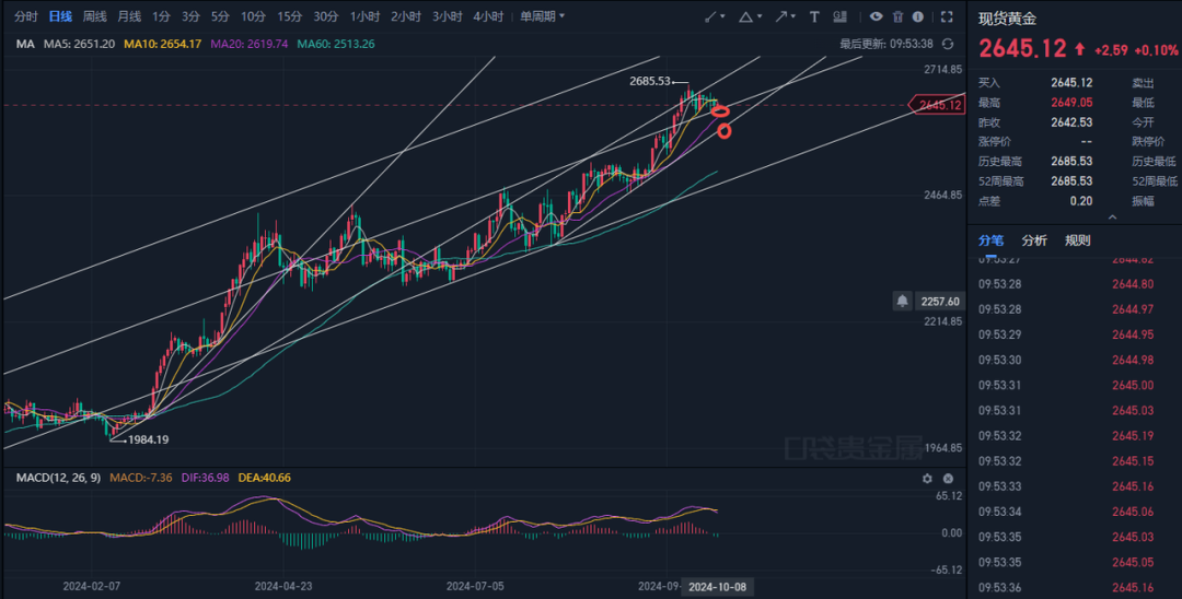 行情回顧:近期就業(yè)數(shù)據(jù)靚麗,投資者降低了對美聯(lián)儲11月大幅降息的預期,美元保持強勢,美債收益率時隔兩個月首次升破4%,令金價承壓?,F(xiàn)貨黃金延續(xù)回調,錄得日線四連陰,盤中最低觸及2637.71美元/盎司,最終收跌0.40%,報2642.63美元/盎司,市場對美聯(lián)儲降息幅度的預期減少。