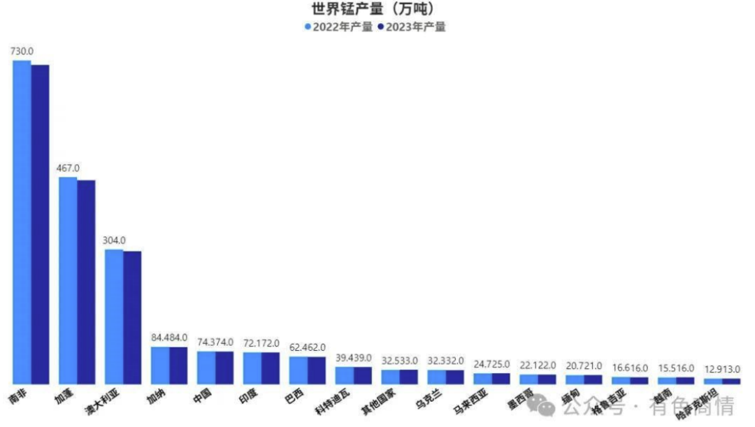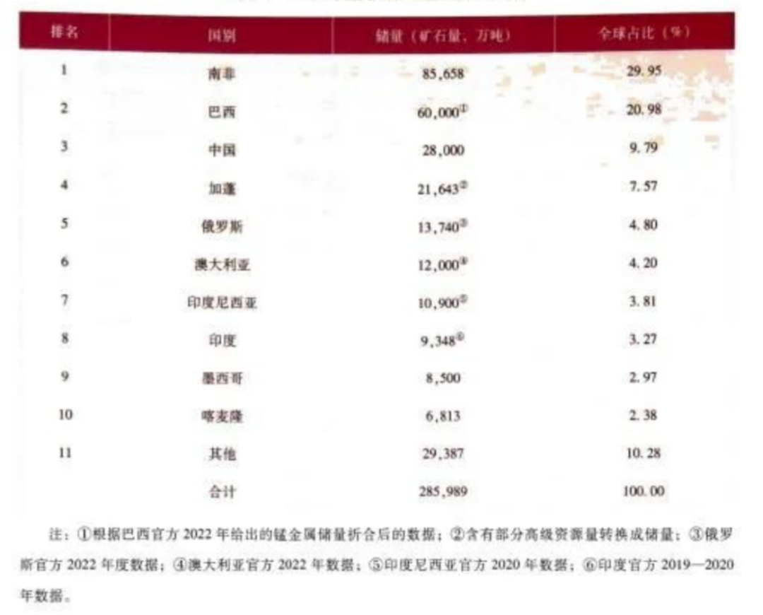 錳礦,是一種非常重要的戰(zhàn)略礦產(chǎn)資源,尤其是富錳礦和優(yōu)質(zhì)錳礦資源,已經(jīng)被中國列入到緊缺的礦種。錳及其化合物應(yīng)用于國民經(jīng)濟的各個領(lǐng)域,每輛特斯拉Model 3需要6.8公斤錳,而比亞迪刀片電池的磷酸錳鋰技術(shù)對高純度錳需求激增,錳已成為鋼鐵、新能源、新材料等產(chǎn)業(yè)的基本原料。從儲量分布來看,根據(jù)中國地調(diào)局發(fā)布的《全球礦產(chǎn)資源儲量評估報告2024》顯示,全球錳儲量28.6億噸(礦石量,下同),主要分布在南非(29.95%)、巴西(20.98%)、中國(9.79%)和加蓬(7.57%)等國,俄羅斯、澳大利亞、印度尼西亞、印度、墨西哥和喀麥隆等國家也有少量分布。