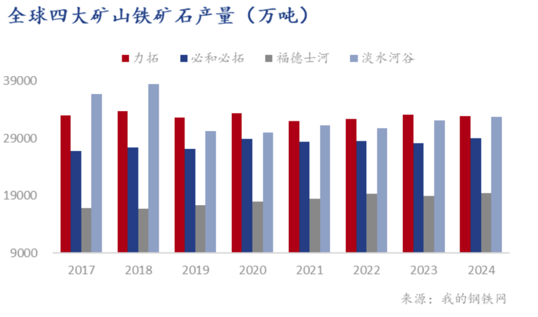 據(jù)統(tǒng)計,四大礦山2024年鐵礦石總產(chǎn)量達11.39億噸,同比增加1600萬噸,增幅1.4%。具體來看,澳大利亞三大礦山巨頭表現(xiàn)相對平穩(wěn),合計產(chǎn)量超過8億噸,同比增長930萬噸,而巴西的淡水河谷表現(xiàn)則相對突出,淡水河谷2024年鐵礦石產(chǎn)量達到3.28億噸,同比增加652萬噸,超過原定的3.1-3.2億噸指導(dǎo)目標(biāo),創(chuàng)下2018年以來的新高。同時,淡水河谷全年鐵礦石銷量實現(xiàn)了約3.07億噸,同比增長4.02%,達到了2019年以來最好的銷量數(shù)據(jù)。