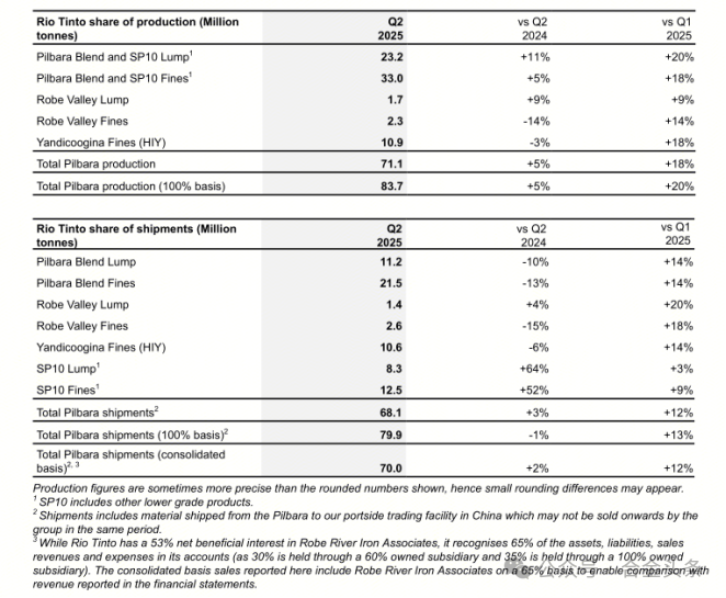 產(chǎn)量方面,2025年第二季度,皮爾巴拉業(yè)務(wù)鐵礦石產(chǎn)量(100%基準(zhǔn))為7748.0萬噸,環(huán)比上漲14.2%,同比上漲0.9%。