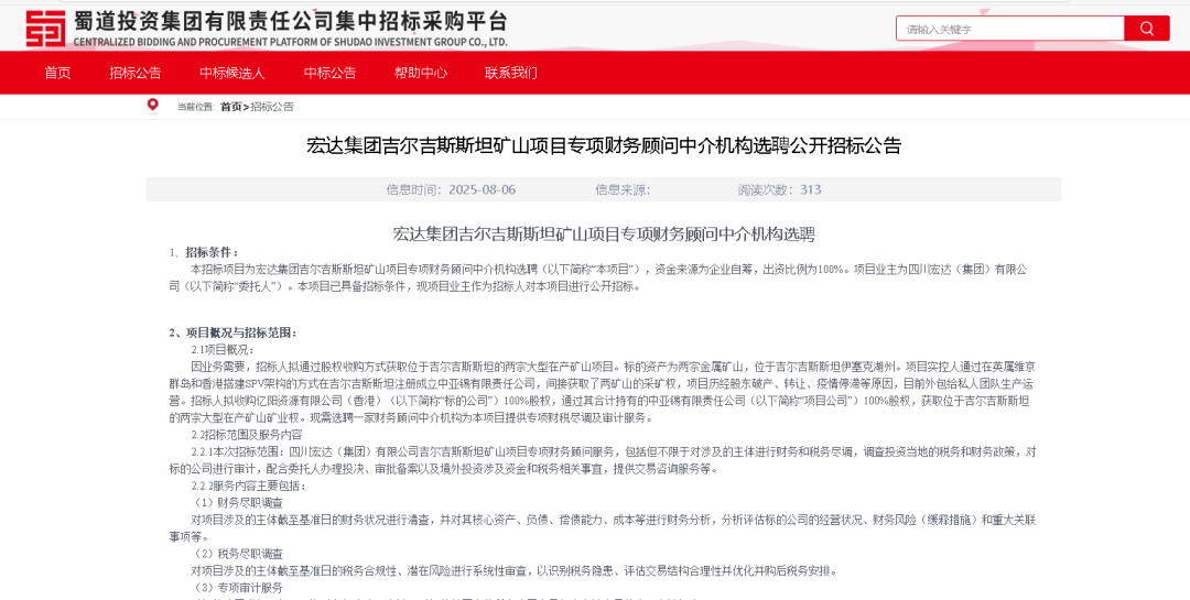 消息源于蜀道投資集團(tuán)集中招標(biāo)采購平臺發(fā)布的《宏達(dá)集團(tuán)吉爾吉斯斯坦礦山項(xiàng)目專項(xiàng)財(cái)務(wù)顧問中介機(jī)構(gòu)選聘公開招標(biāo)公告》。公告顯示,宏達(dá)集團(tuán)計(jì)劃收購億陽資源有限公司 (香港) 100% 股權(quán),通過這一操作,將間接掌控中亞錫有限責(zé)任公司100% 股權(quán),進(jìn)而獲取位于吉爾吉斯斯坦伊塞克湖州的兩宗大型在產(chǎn)礦山礦業(yè)權(quán)。為順利推進(jìn)收購,宏達(dá)集團(tuán)正在公開選聘一家財(cái)務(wù)顧問中介機(jī)構(gòu),為項(xiàng)目提供專項(xiàng)財(cái)稅盡調(diào)及審計(jì)服務(wù),項(xiàng)目資金全部來源于企業(yè)自籌。